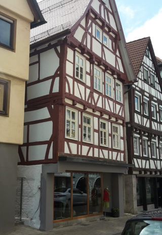 Das aus dem 15. Jahrhundert stammende, denkmalgeschützte Fachwerkgebäude befindet sich am Rande der historischen Altstadt von Bad Urach. Auf Grund diverser Renovierungen im Laufe der vergangenen Jahrhunderte war vom ursprünglichen Erscheinungsbild des mittelalterlichen Bauwerks nur wenig zu erahnen. Im Zuge der Sanierungsmaßnahmen wurde die Fachwerk - Giebelfassade entlang der Wilhelmstraße von den Putzschichten der 1960er Jahre befreit und in enger Zusammenarbeit mit der Denkmalschutzbehörde von Restauratoren untersucht und behutsam restauriert. Das schließlich gewählte Farbkonzept für die Fassade entspricht einer der, am Gebäude vorgefundenen historischen Farbfassungen. Das Gebäude mit zwei Wohnungen und einem Ladengeschäft wurde auch im Innenbereich grundlegend saniert und hierbei energetisch und brandschutztechnisch auf heutigen Standard gebracht.